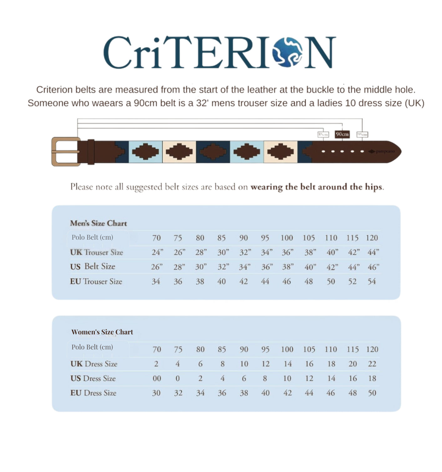 Choosing the right belt size is simple with Criterion’s size guide. Our belts are measured from the start of the leather at the buckle to the middle hole, giving you the most accurate fit.